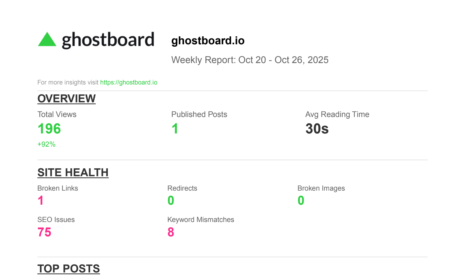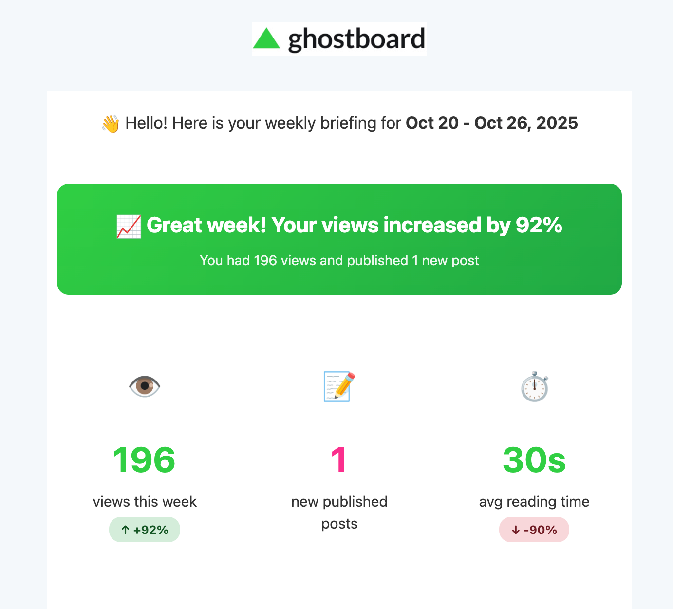 Every weekly report packs the same insights you already love in Ghostboard โ in a quick, scannable format: