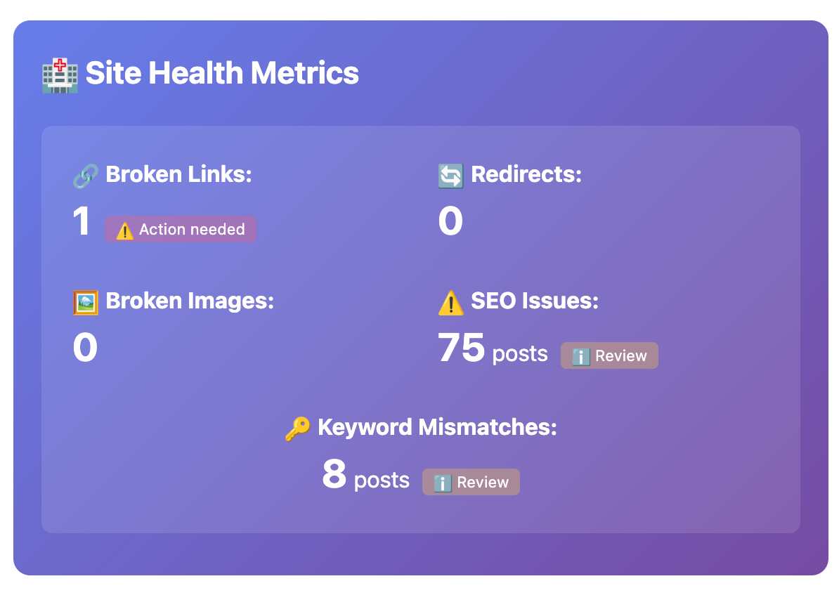 - SEO health highlights. Quick wins and fixes to protect rankings.