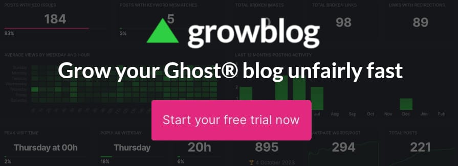 Start your free trial now and double down on what works on your Ghost blog to grow unfairly fast. No credit card is required.