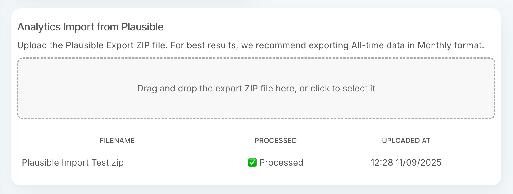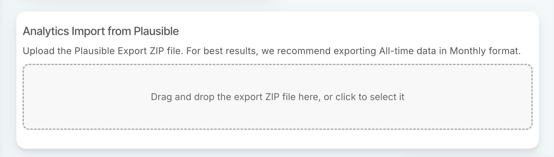 - Upload the ZIP file you downloaded from Plausible. You don't need to take any further action.