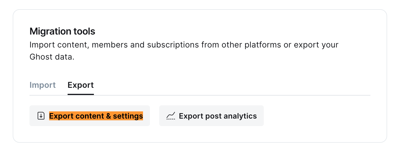 - Click Export: Ghost will create a JSON file containing your posts, tags, images, and metadata.